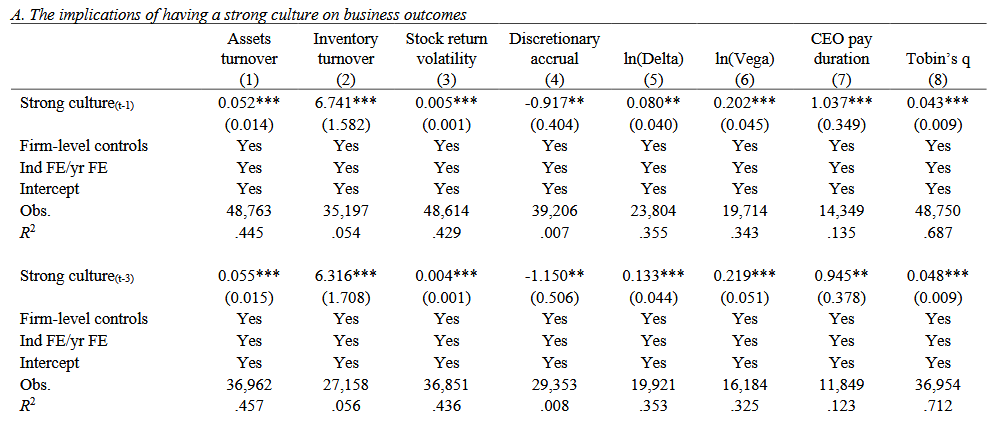 Define “strong culture” as “Strong culture is an indicator variable that takes the value of one if the sum of a firm’s five cultural values is in the top quartile across all Compustat firms in a year, and zero otherwise.”