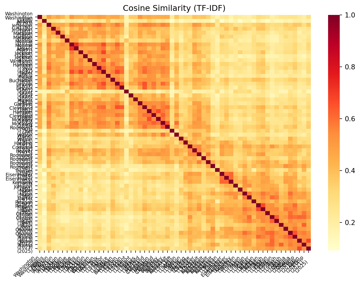nltk.download('inaugural')from nltk.corpus import inauguralus = pd.DataFrame([ {"year": int(parts[0]),"speaker": parts[1],"text": inaugural.raw(fid), }for fid in inaugural.fileids()for parts in [fid.replace('.txt', '').split('-', 1)]])