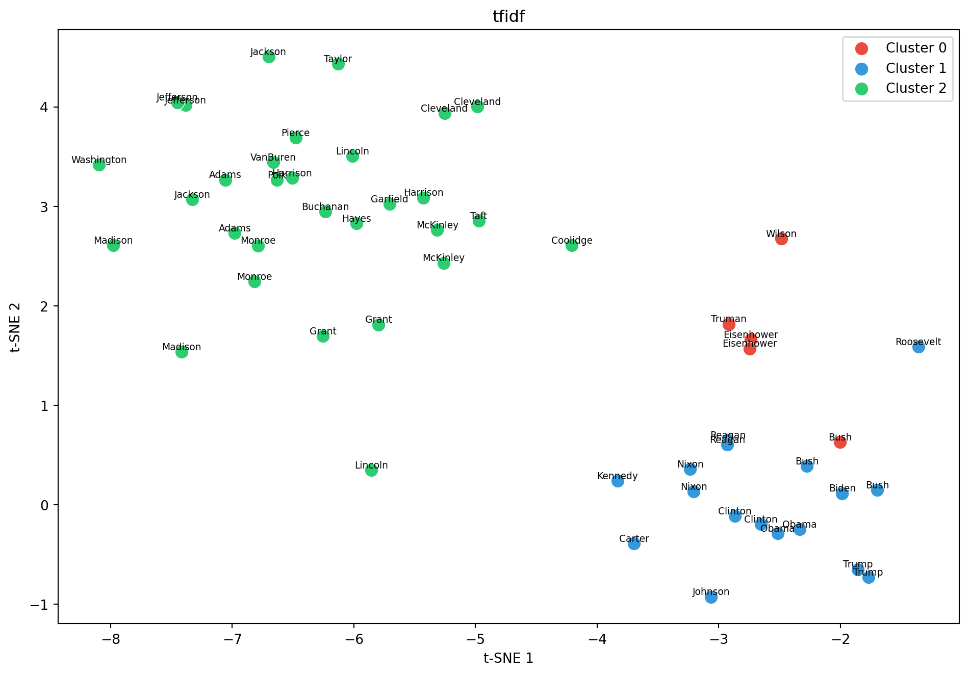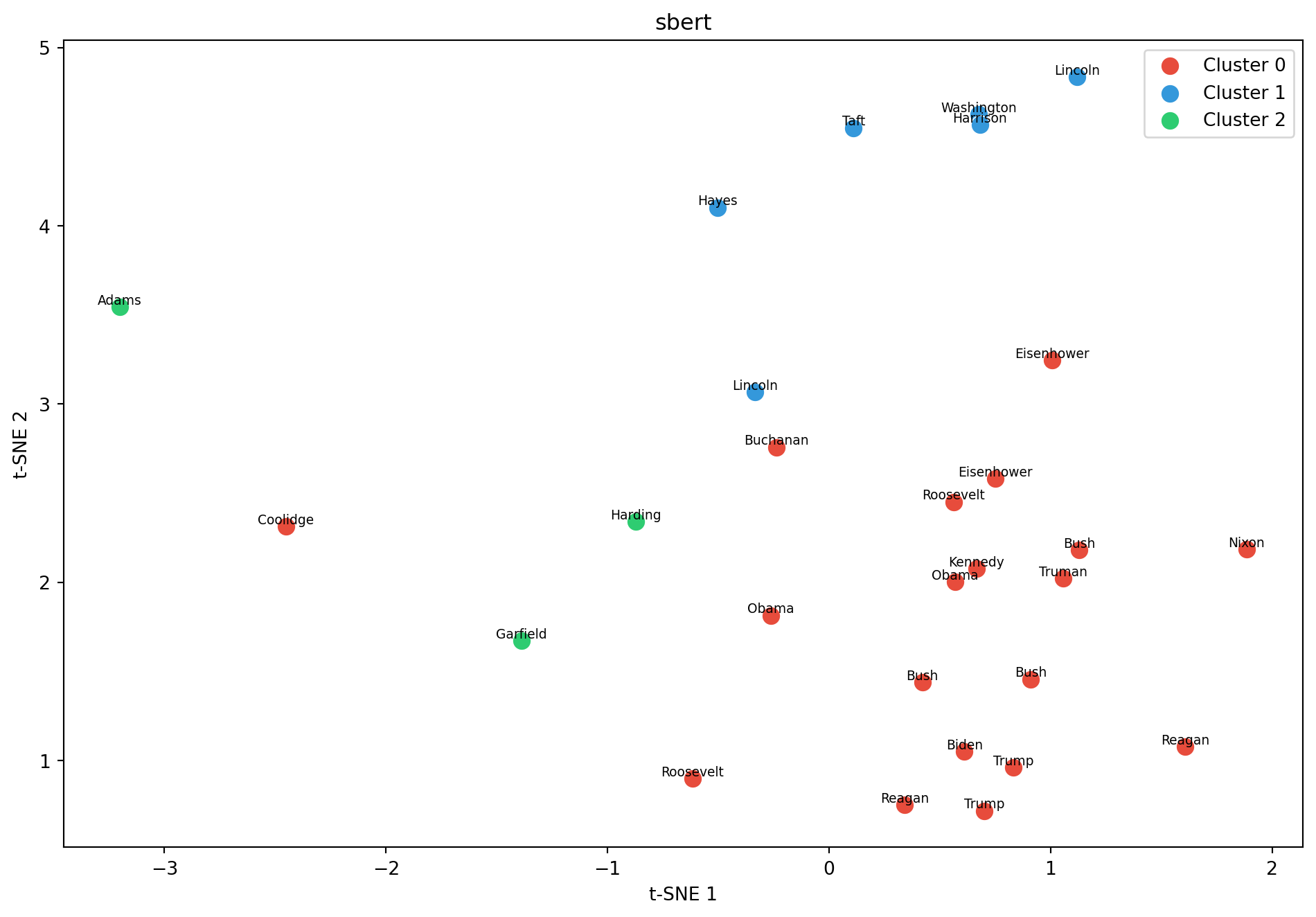 X = sbert.encode(us["text"].tolist())cluster_and_plot(X, "sbert")