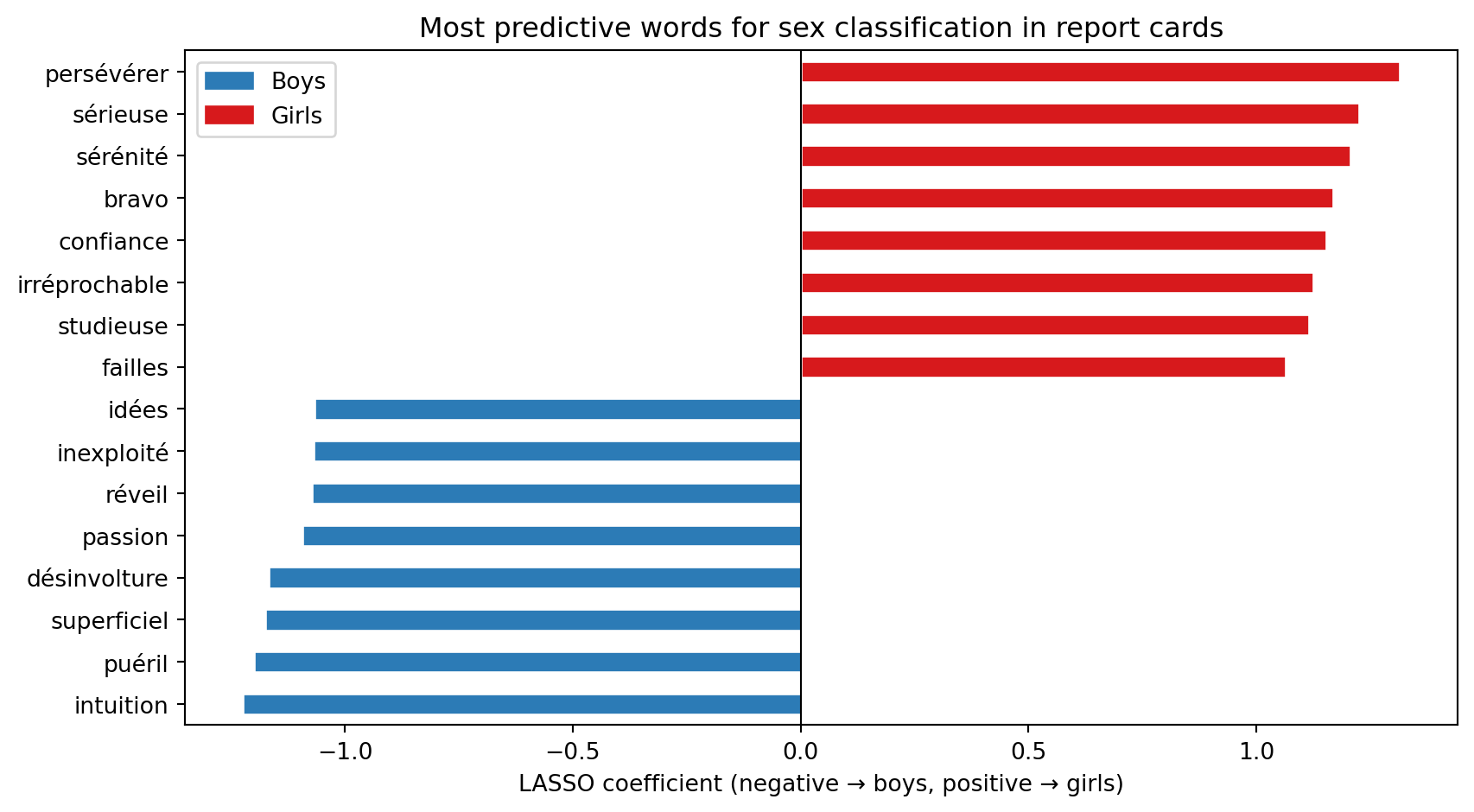 # Synthetic data to illustrate the techniquefemale_words = ["sérieuse", "exemplaire", "persévérer", "appliquée", "studieuse","difficultés", "fragilités", "failles", "hésitations", "découragée","irréprochable", "confiance", "bravo", "efforts", "sérénité"]male_words = ["intuition", "passion", "curiosité", "idées", "aisance","brouillon", "dilettante", "désinvolture", "puéril", "agité","s'amuse", "superficiel", "endormi", "inexploité", "réveil"]neutral_words = ["travail", "résultats", "trimestre", "niveau", "progrès"]def generate_report(sex, n=300): words = []if sex =="female": words += np.random.choice(female_words, size=4, replace=True).tolist() words += np.random.choice(male_words, size=1, replace=True).tolist()else: words += np.random.choice(male_words, size=4, replace=True).tolist() words += np.random.choice(female_words, size=1, replace=True).tolist() words += np.random.choice(neutral_words, size=3, replace=True).tolist() np.random.shuffle(words)return" ".join(words)n_students =500sexes = np.random.choice(["female", "male"], size=n_students)reports = [generate_report(s) for s in sexes]y = (sexes =="female").astype(int)vectorizer = CountVectorizer(max_features=200)X = vectorizer.fit_transform(reports)clf = LogisticRegression( penalty="l1", # lasso C=0.5, solver="liblinear", random_state=42 )scores = cross_val_score(clf, X, y, cv=5, scoring="accuracy")print(f"Gap: +{(scores.mean()-0.5)*100:.1f} pp")# Visualise the most predictive wordsclf.fit(X, y)feature_names = vectorizer.get_feature_names_out()coefs = pd.Series(clf.coef_[0], index=feature_names).sort_values()top_male = coefs.head(8) # negative coef → maletop_female = coefs.tail(8) # positive coef → femaletop = pd.concat([top_male, top_female])colors = ["#2c7bb6"if c <0else"#d7191c"for c in top]fig, ax = plt.subplots(figsize=(9, 5))top.plot(kind="barh", color=colors, ax=ax, edgecolor="white")ax.axvline(0, color="black", linewidth=0.8)ax.set_xlabel("LASSO coefficient (negative → boys, positive → girls)")ax.set_title("Most predictive words for sex classification in report cards")blue_patch = mpatches.Patch(color="#2c7bb6", label="Boys")red_patch = mpatches.Patch(color="#d7191c", label="Girls")ax.legend(handles=[blue_patch, red_patch])plt.tight_layout()plt.show()